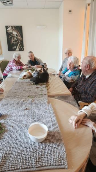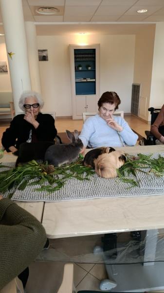 La première séance s’est déroulée en groupe à l’unité protégée. Les résidents ont pu caresser les animaux et partager un moment agréable autour de leur présence.
